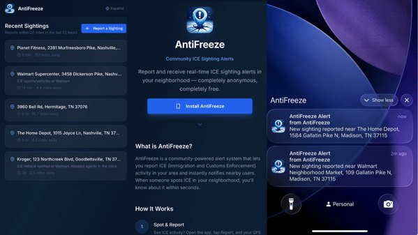 AntiFreeze lets anyone anonymously report an ICE sighting. When someone submits a report, every user within five miles gets a push notification on their phone in real time. If ICE is spotted four blocks from your house while you’re making dinner, your phone buzzes and tells you.