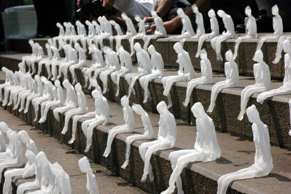 The installation features small ice figures sitting on public steps around parts of the world begin melting almost as soon as they are set in place, reminding us our our short time here on this planet and the ephemeral nature of our place.