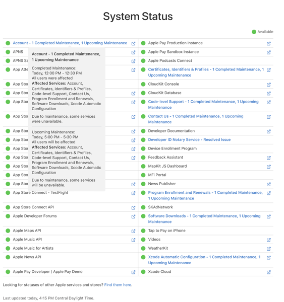 John Gruber on Daring Fireball pointed to Apple’s Developer System Status dashboard that showed maintenance scheduled for that Friday evening and another scheduled for the next day under “Account.” So that may be a possibility. Without any communication from Apple users are left in the dark.
